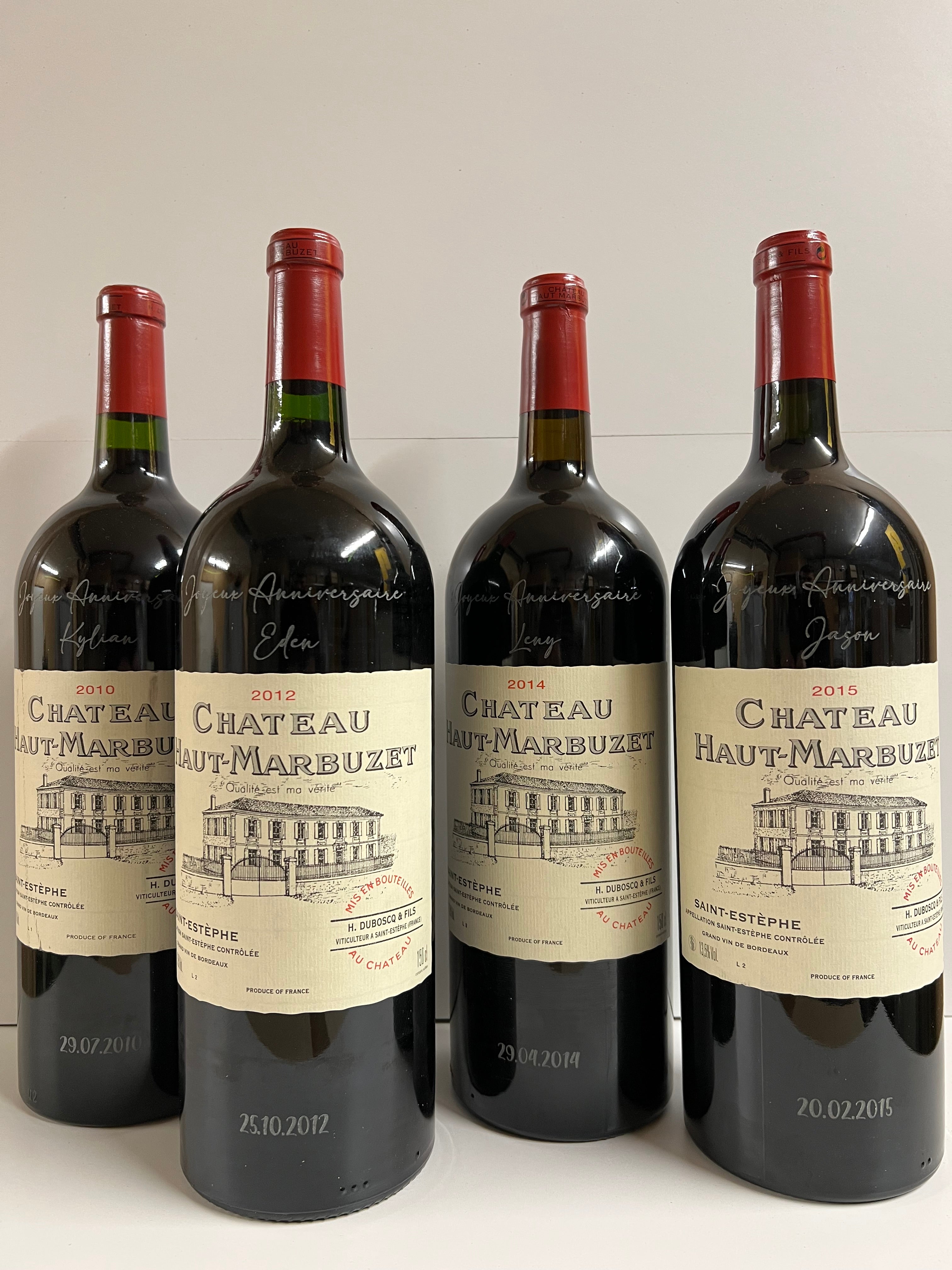 Gravures laser sur bouteilles en verre, réalisées pour des projets personnalisés et des événements.