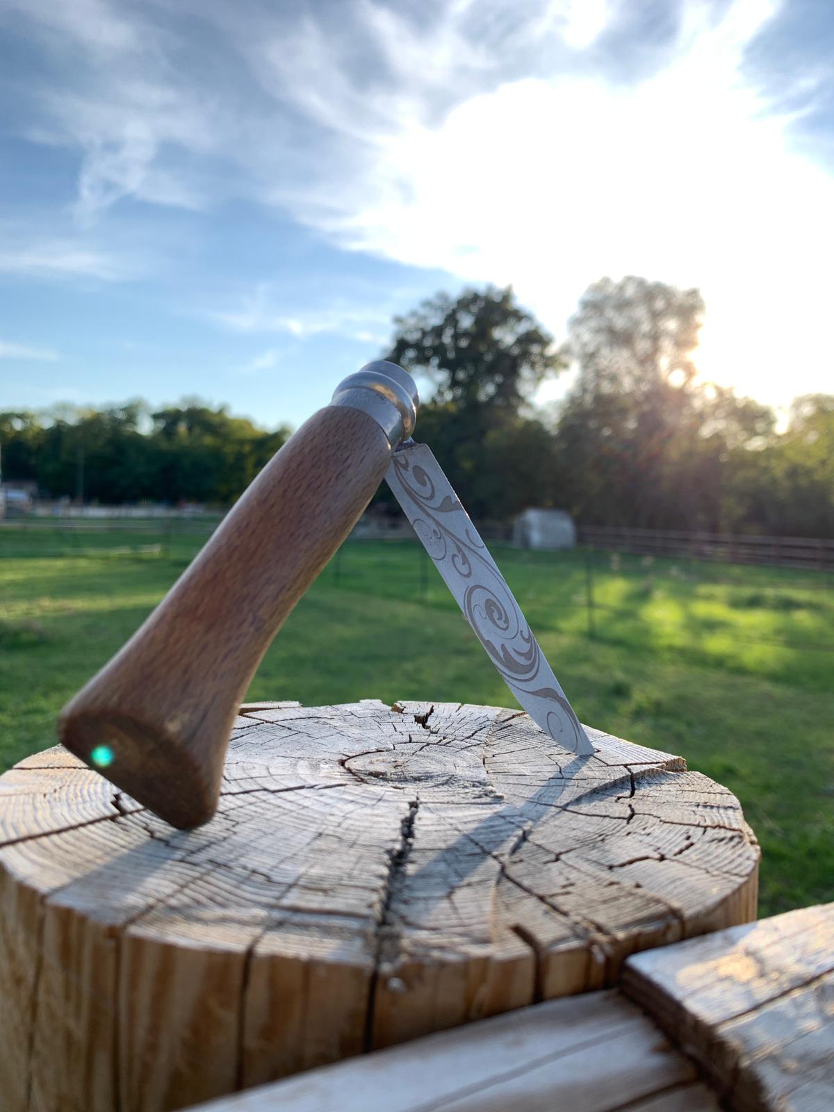 Gravure laser sur lame en acier inoxydable, réalisée pour une personnalisation durable.